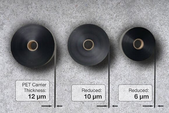 With the revolutionary KURZ KPS slim cold transfer products, we have succeeded in significantly reducing the PET carrier material for metallization. This not only helps to minimize plastic waste in your production but also allows each transfer roll to accommodate more running meters of usable decoration. As a result, you get increased usability, more time for applying embellishments, and less time spent on roll changes.
